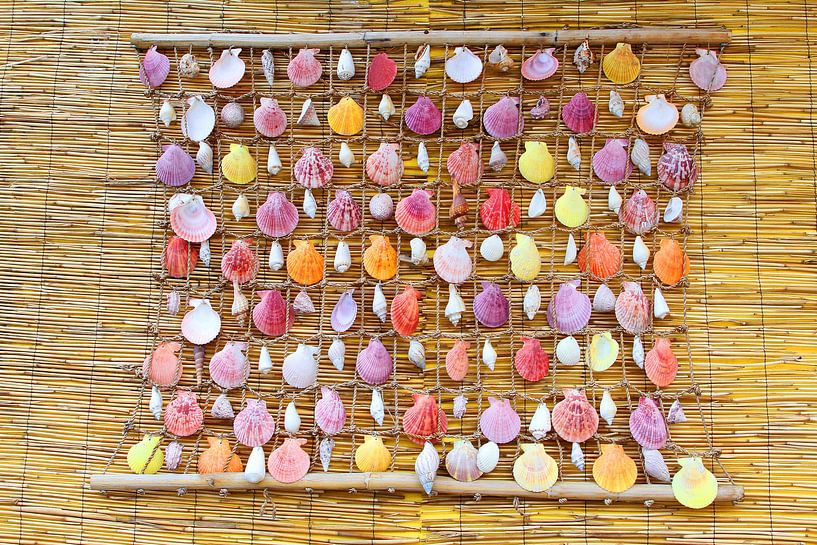 Shells in many different colours in a frame on the background of a wicker reed wall. A decorative Mediterranean wall decoration of a shell collection from Greece.