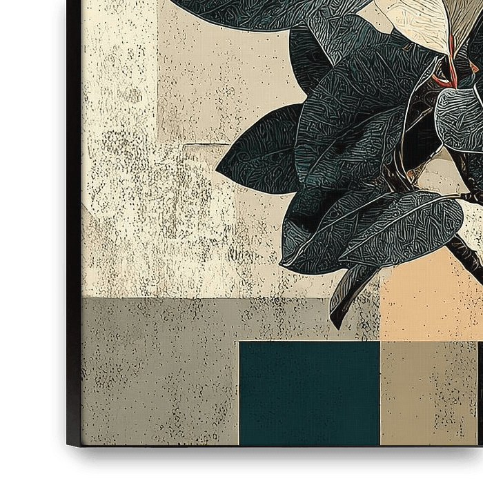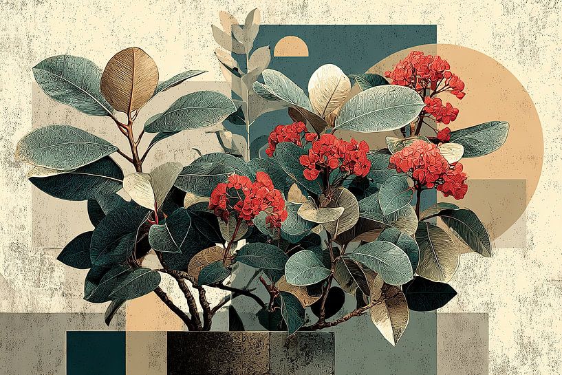 Bold Floral Expression - This botanical painting depicts a potted plant with glossy green leaves and vibrant red flowers, set against a background of abstract shapes in neutral tones, giving a fresh and modern look to any space.