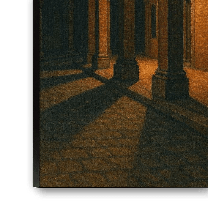The artist draws from the psychological depth of Edward Hopper, infusing Italian geometry with cinematic introspection. The scene is devoid of people, yet alive with presence — a silence charged with invisible stories. Wet stones shimmer with reflected amber; shadows dance between columns like breath.