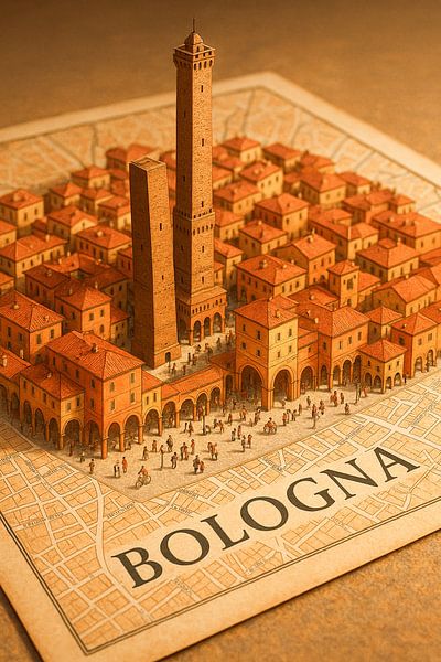 Buy this landscape artwork Bologna Two Towers 3D Map – Medieval Italy Wall Art by Travel Shop on canvas, ArtFrame, poster and wallpaper, printed on demand in high quality.