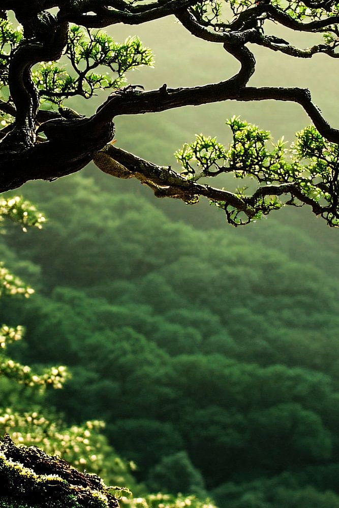 This beautiful image shows an ornate bonsai tree on a rock, bathed in soft natural light. The winding branches and vibrant green leaves form a serene and soothing composition, perfect for lovers of nature and minimalist beauty. Ideal for decoration in a living or office space.