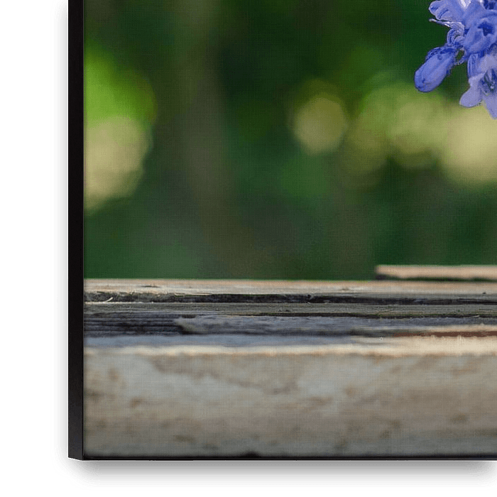 Flowers of the wood hyacinth in a brown vase on rough wooden planks with forest in the background.