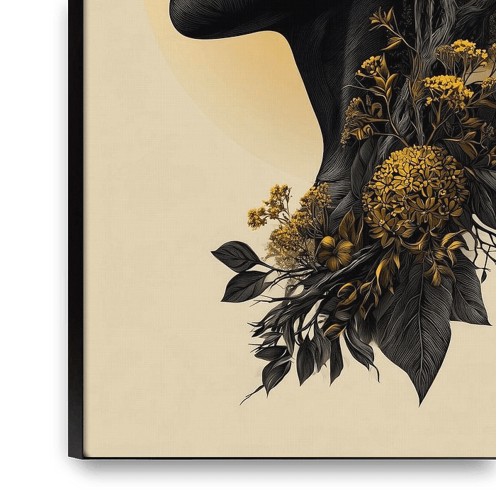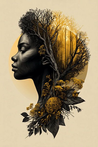 This powerful artwork captures a moment of calm, connection and self-reflection. In a sophisticated double-exposure, a woman's profile, lush flowers and a mystical forest landscape fuse into one harmonious whole. The warm gold tones contrast beautifully with the deep black, giving the work a timeless and elegant look.