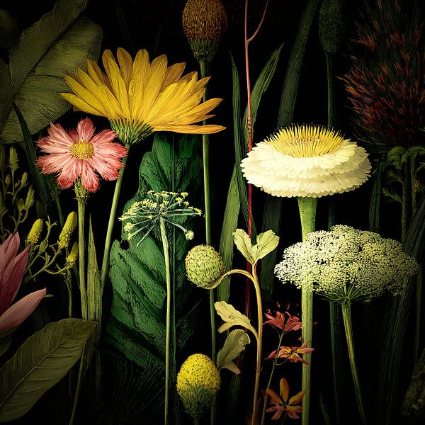 Botanical flower art against black background by Vlindertuin-Art