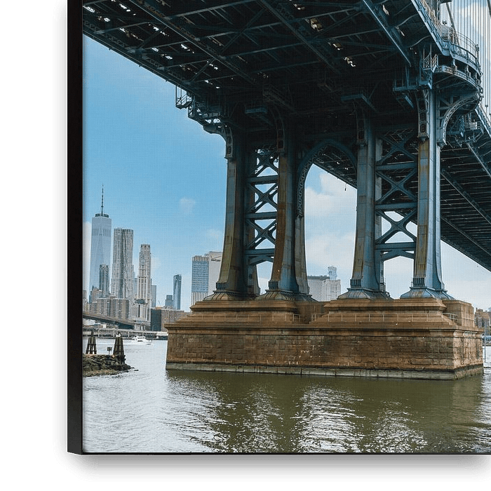 Bottom of the Manhatten bridge with left behind downtown New York on a sunny day