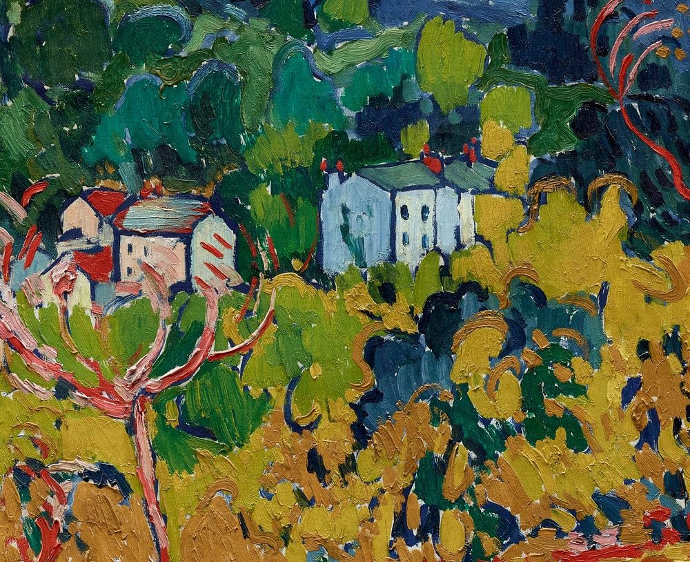 "Bougival" is one of the finest compositions Vlaminck painting during his brief yet prolific period as a fauve painter. It is characterized by a strong compositional balance, harmony of vibrant colors, and confident placement of brushstrokes. Following the French classical tradition of landscape painting, Vlaminck organized the canvas into three zones. Vibrant yellows and reds, highlighted by dashes of pink, animate the foreground, while deeper greens, blues, and yellows dominate the middle of the picture. In the background, a softer blend of colors creates an impression of deeper spatial recession in the river and sky.