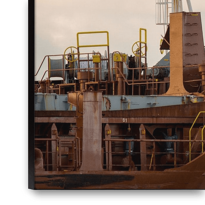 An imposing bow of a seagoing vessel protrudes raw and rusty above the water, The mast on the foredeck with lights and the ship's horn , anchor winches and metal railings. Over the deck and gunwales lies a patina of wear and salt. As clouds gather over the horizon, sunrise colours the steel…