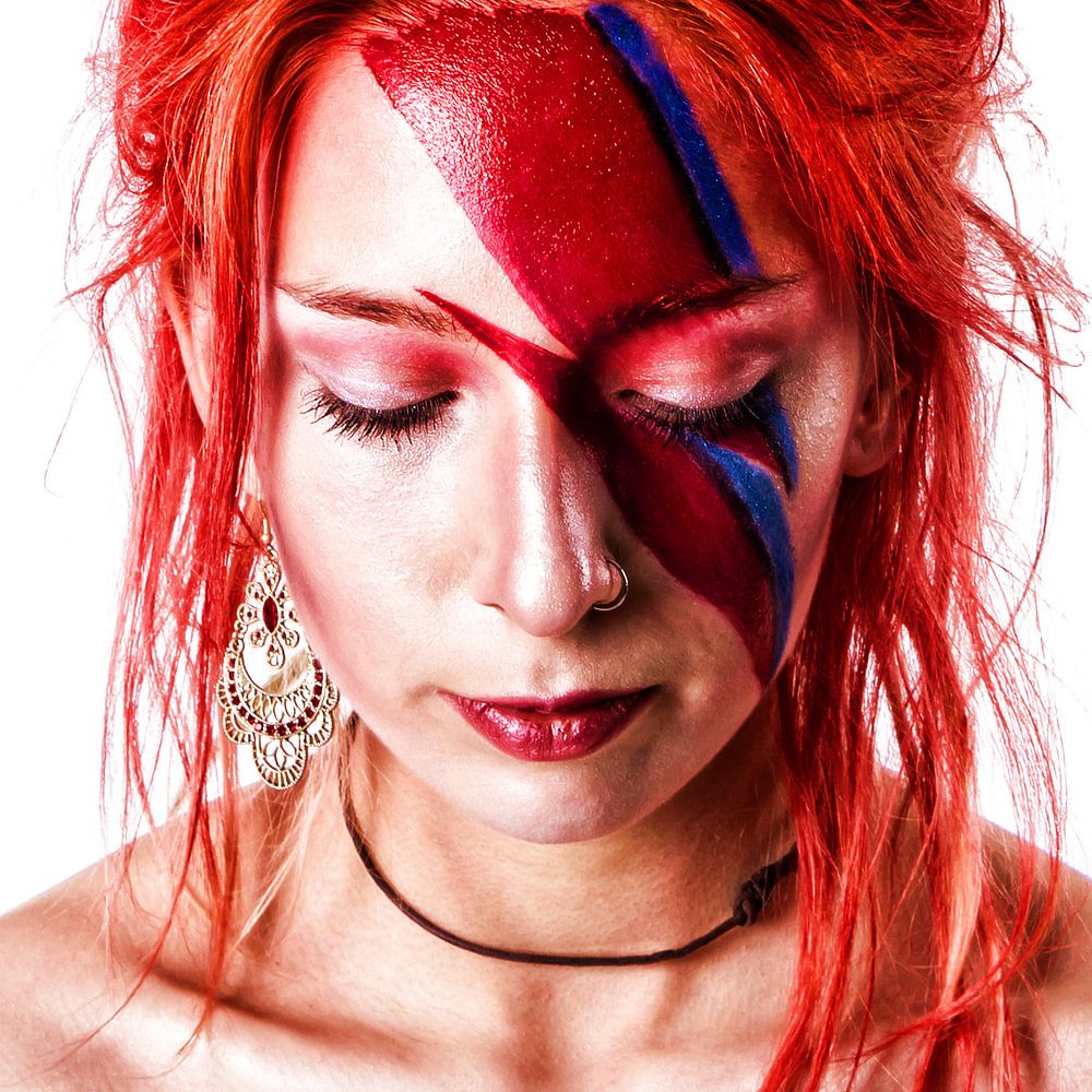 David Bowie look-alike Rosa 2 met make-up geïnspireerd op zijn album Aladdin Sane.