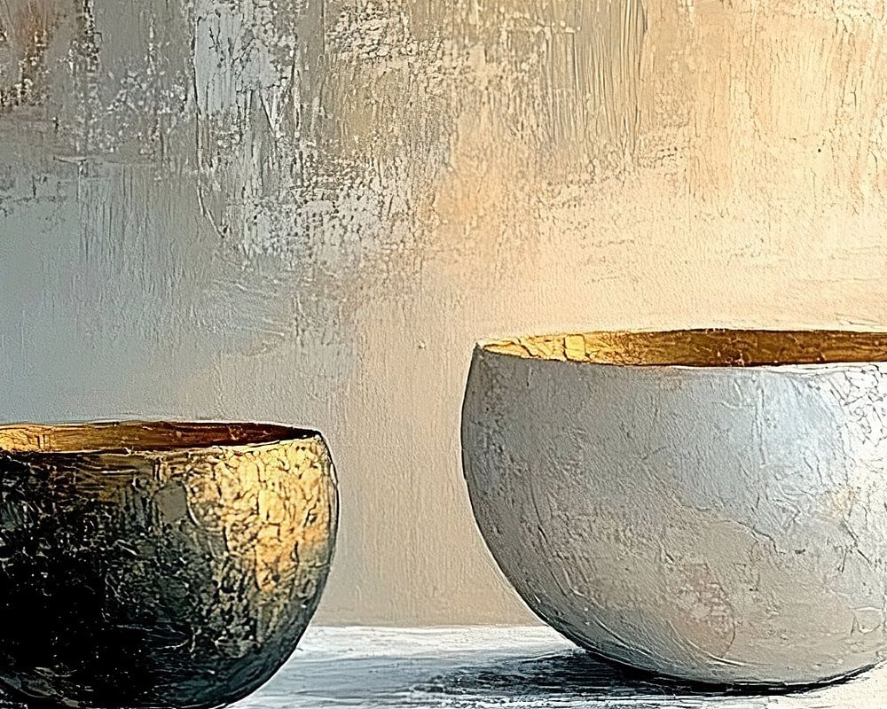 Details: bowl, gold, beige, grey, texture, contrast, still life, painting, light, dark