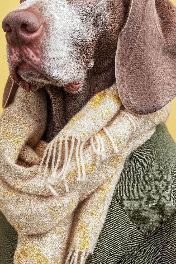 With his gentle, expressive eyes and long, fluffy ears, the Bracco Italiano radiates a charming elegance. Wrapped in a stylish coat and adorned with a fashionable scarf, he playfully combines the character of a distinguished gentleman with the light-heartedness of a loyal friend. A look that tells stories!