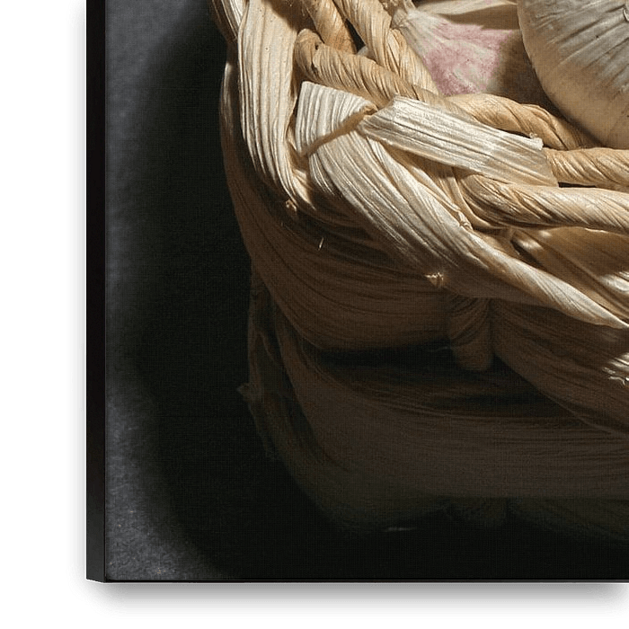 Braided basket, full of fresh garlic balls.