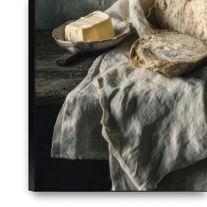 Fresh bread and butter lie on rough linen. The light is soft and hushed. A classic and comforting image that fits perfectly into rural and serene interiors.
