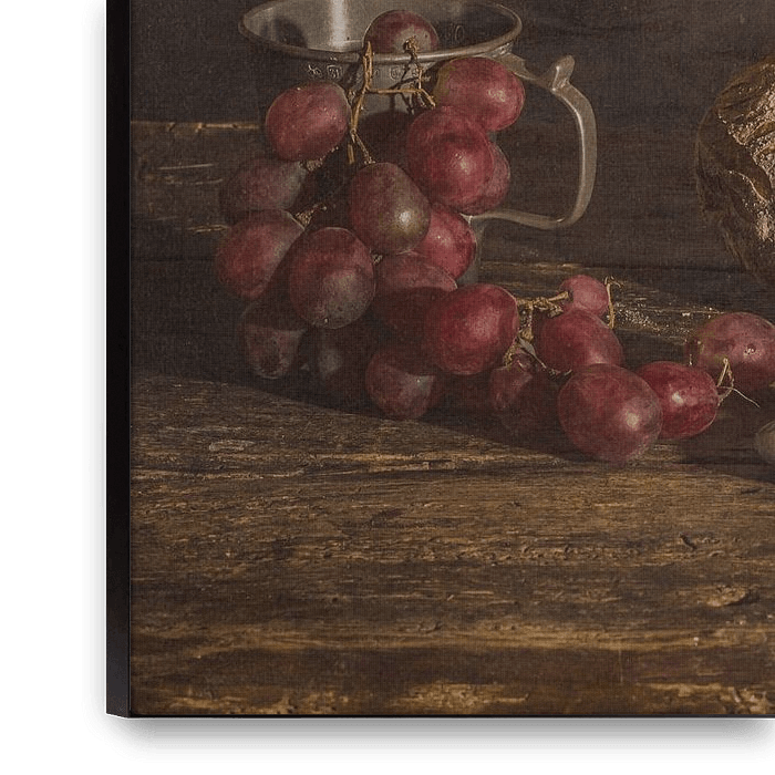 And still life in the style of the old masters with rustic sourdough bread, red grapes, pears, a pewter cup, a pewter bowl with walnuts, an old knife and an antique pewter coffee pot from the 19th century on a wooden table.