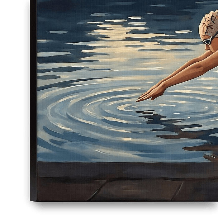 This painting captures a moment of defiance and grace, blending human motion with architectural stillness. As the artist, I sought to juxtapose the fluidity of the human form against the rigidity of rules and structure. The central figure—a woman mid-dive in a vibrant red swimsuit—embodies freedom and spontaneity, her body slicing…