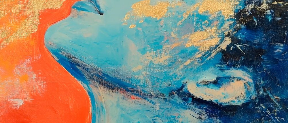 A harmonious interplay of lively shades of blue and a powerful orange tone unfolds here, while a calm, dreamy figure seems to float in the colours of life. The flowing lines and explosive colouring give the room a dynamic atmosphere. Ideal for a creative office or inspiring living room to get thoughts flowing.