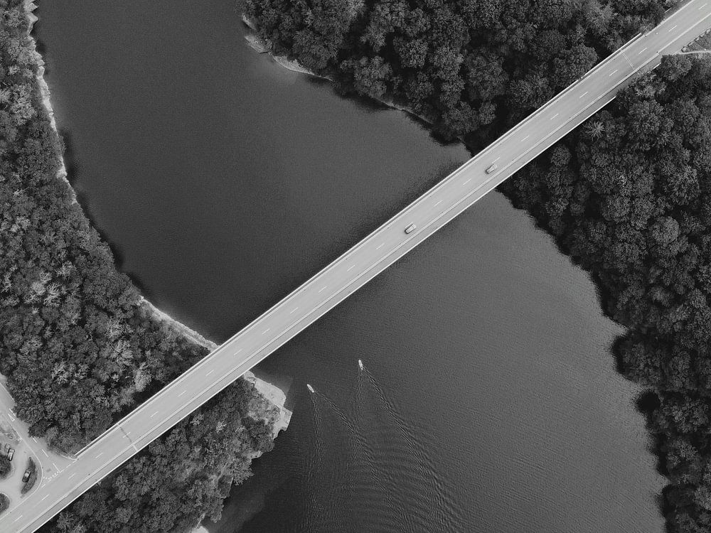 The image shows a car bridge connecting two sides. A forest edge can also be seen running alongside the water.