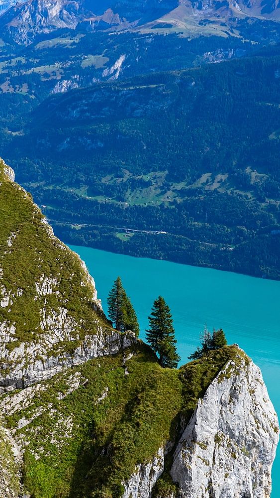 View of the turquoise Brienzersee from Suggiture, near Interlaken in Switzerland.
