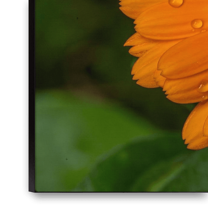 What do you see in the artwork? An intense top view of a bright orange-coloured marigold (calendula). The flower dominates the picture with its rich, warm colours, which change from golden yellow in the centre to a deep orange at the edges. Small, clear drops of water pearl on the petals, emphasising the freshness of the moment and the…