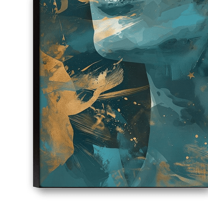 Portrait of a woman facing a sunny day. She looks into the sun enjoying life. Colours gold, petrol, blue, black and white. Pop art. Abstract and sophisticated. Matching various styles and trends.