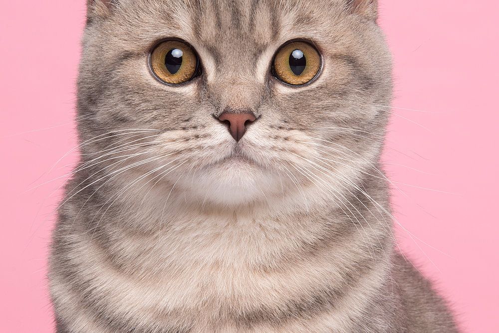 Portrait of a British shorthair cat on a pink background