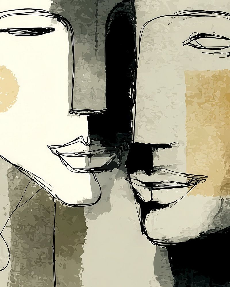 Two faces merge into a single form, yet remain separated by a dark axis. The sculpture symbolises an inner conflict: light and shadow, reason and emotion. The golden surfaces suggest value in both sides, as if opposites do not exclude one another but rather complement each other.