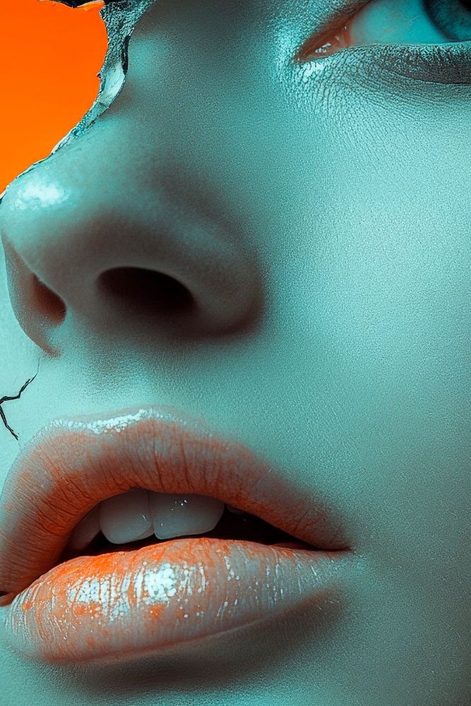 A fascinating fusion of fragility and beauty unfolds here: A face from which the fragments of a glass protrude, surrounded by a warm, vibrant orange colour. This exciting depiction is wonderfully suited to a modern living room, where it encourages reflection and sparks conversation.