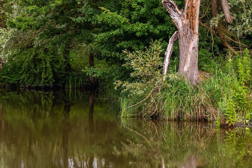 Trees and plants reflected in the smooth water surface of the Middle Hole of De Plomp, a creek in the hot Dutch National Perk De Biesbosch near the village of Werkendam, municipality of Altena Noord-Brabant.