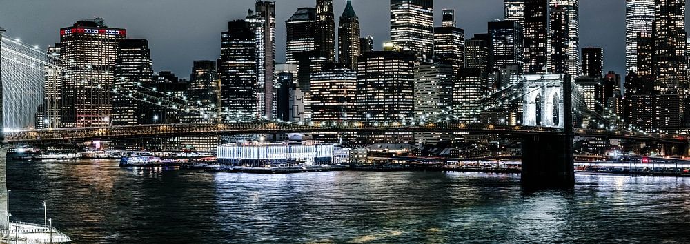 The Brooklyn Bridge at night - seen from Brooklyn, with the glittering skyline of downtown Manhattan in the background. The lights of the city are reflected in the water, while the bridge's iconic steel cables criss-cross the city sky at night. A timeless view of the magic of New York at sunset.