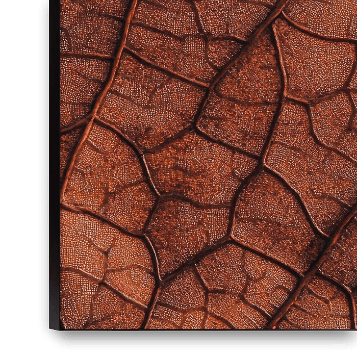 Soft earthy tones envelop the surface, while fine cracks and veins form a fascinating pattern. The leaves look like the remnants of a bygone summer, their weathered texture telling stories of wind and weather. A play of light and shadow awakens nature in a new, melancholy light and inspires with subtle beauty.