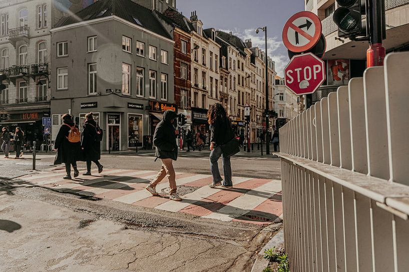 In this street scene, Brussels is captured in a spontaneous yet almost cinematic moment. The soft winter light glides across the façades and casts long shadows across the zebra crossing, whilst passers-by set the city’s rhythm. The contrasting road signs, the architecture and the human movement come together in a composition that…