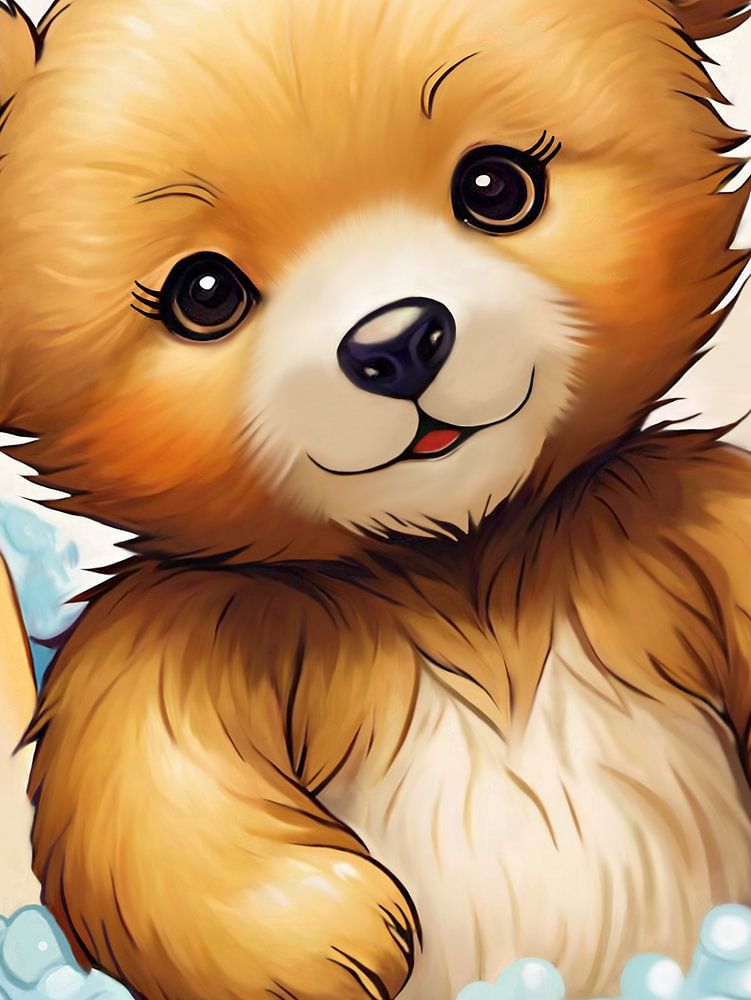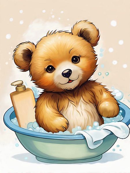 Bring cheer and softness to the baby or nursery with this handmade Procreate artwork. A cute little bear enjoys a foam-filled bath surrounded by shimmering soap bubbles, while his joy and playfulness are instantly perceptible.
