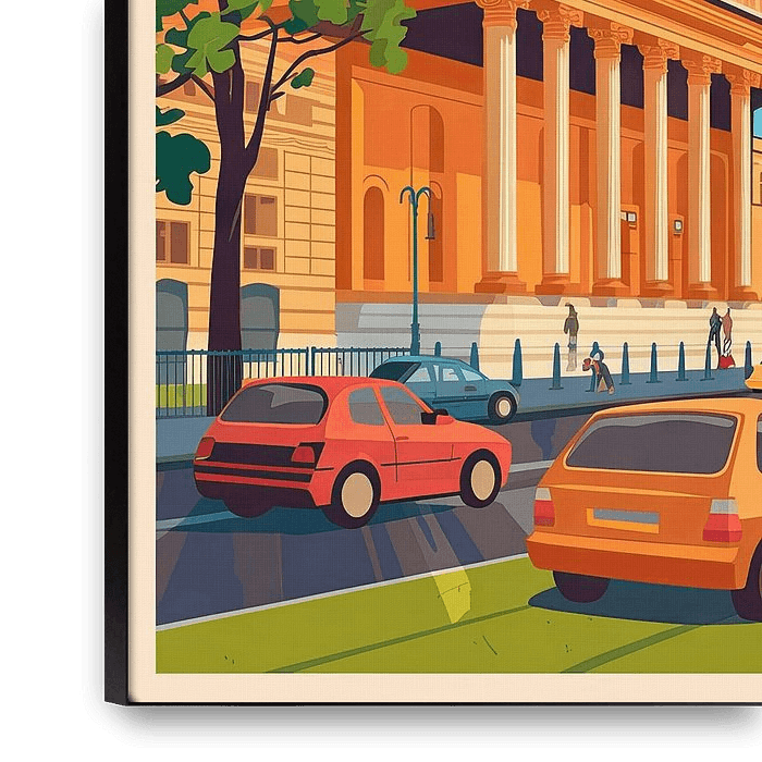 In the heart of Bucharest, a majestic building shines in warm earth tones, surrounded by a blossoming landscape. Under a bright blue sky, pretty cars stand out against the impressive architecture. Elegance and urban charm merge here to create an inviting image of the vibrant life of this dynamic city.