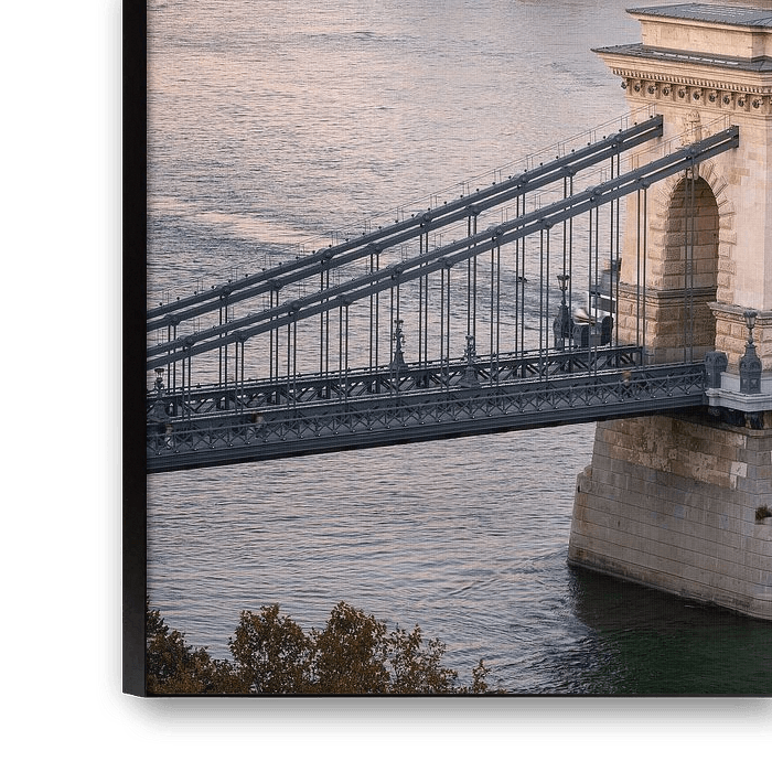 In the foreground you can see a pillar of the famous Chain Bridge of Budapest.
