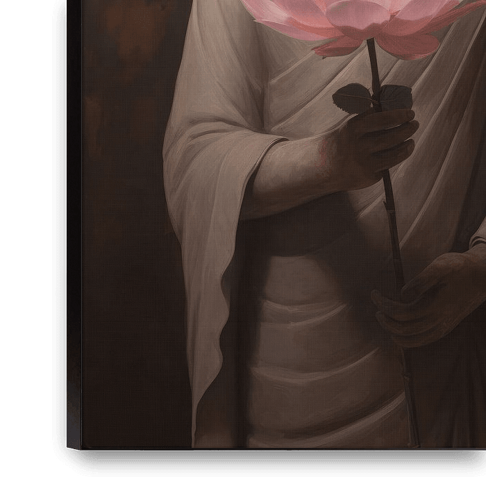 This picturesque portrait of Buddha shows a serene and peaceful expression, enhanced by the soft light falling over the image. In his hand, Buddha holds a beautiful, pink lotus flower - a symbol of purity, enlightenment and rebirth. The details, such as the rich texture of the skin and the delicate folds of his robe, show a masterful…