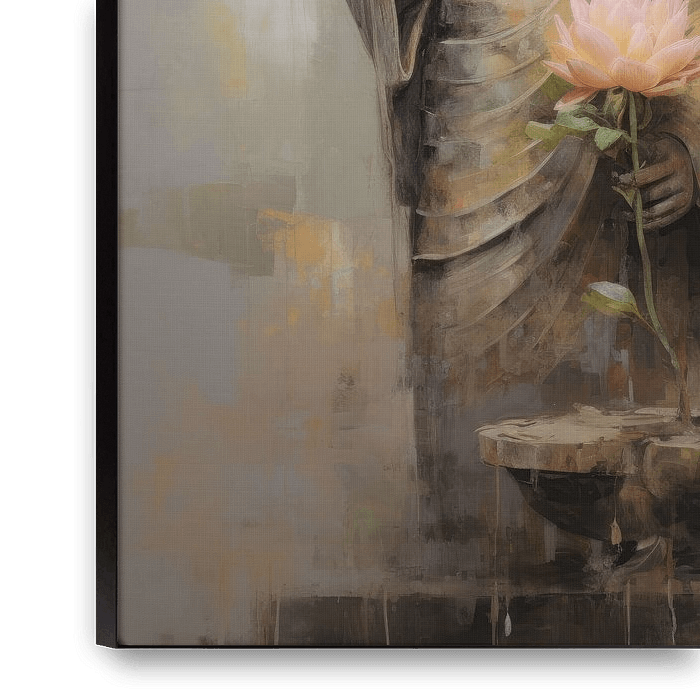 This enchanting digital painting depicts a Buddha holding a delicate pink lotus flower in his hand. The background, fused with earth tones and faint brushstrokes, creates a dreamy landscape that enhances the mystique of the image. This Buddha is part of a series in which most Buddha figures are depicted holding a flower, a symbol of…