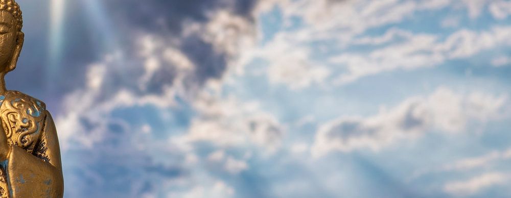 The picture shows a golden Buddha statue in a meditation pose in front of a dramatic sky with rays of sunlight breaking through the cloud cover. The statue is clearly focussed in the foreground and is characterised by fine details and a calm, symmetrical pose. The background consists of a dynamic cloud formation with rays of light that create a spiritual and peaceful atmosphere. The composition combines religious symbolism with natural phenomena and creates an expressive visual motif.