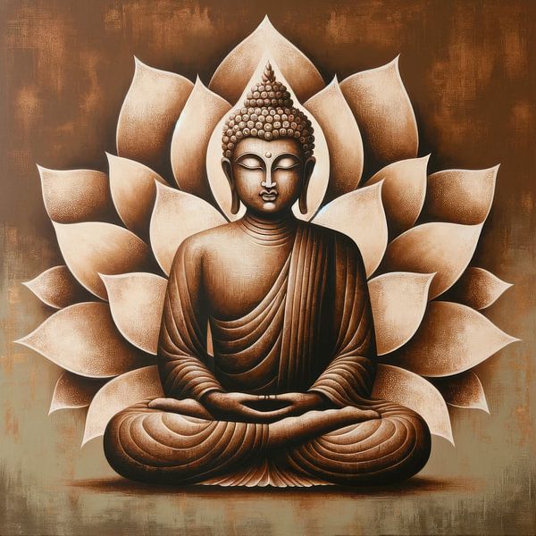 This painting shows a serene Buddha seated in lotus position, enveloped by a large lotus leaf symbolising purity and spiritual awakening. The Buddha is depicted with eyes closed, indicating inner reflection and meditation. His golden robe falls gracefully around his figure, and the earthy, monochrome colour scheme emphasises a sense of tranquillity and unity. The lotus leaf in the background, done in different shades of gold and brown, gives a sense of depth and dimension. The use of light and shadow brings out a texture that is almost tangible, inviting contemplation.