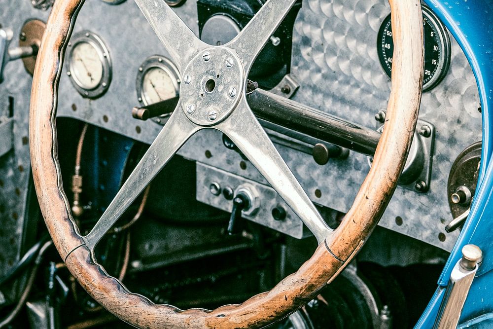 Detail in the interior on a Bugatti Type 35 vintage 1920s race car with a brushed aluminium dashboard. The Bugatti Type 35 was a very successful racing car in its time and was produced in a number of different versions.