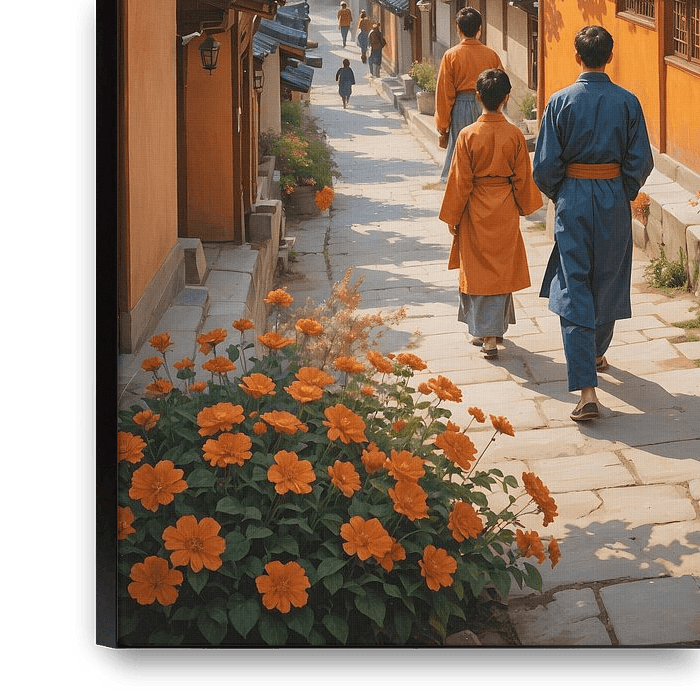 Capture the timeless charm of Bukchon Hanok Village with this exquisite oil painting illustration. This digital wall art beautifully portrays the atmospheric landscape of Seoul’s historic neighborhood, showcasing traditional Korean hanok houses nestled among winding streets and lush greenery. Ideal for adding a touch of cultural…
