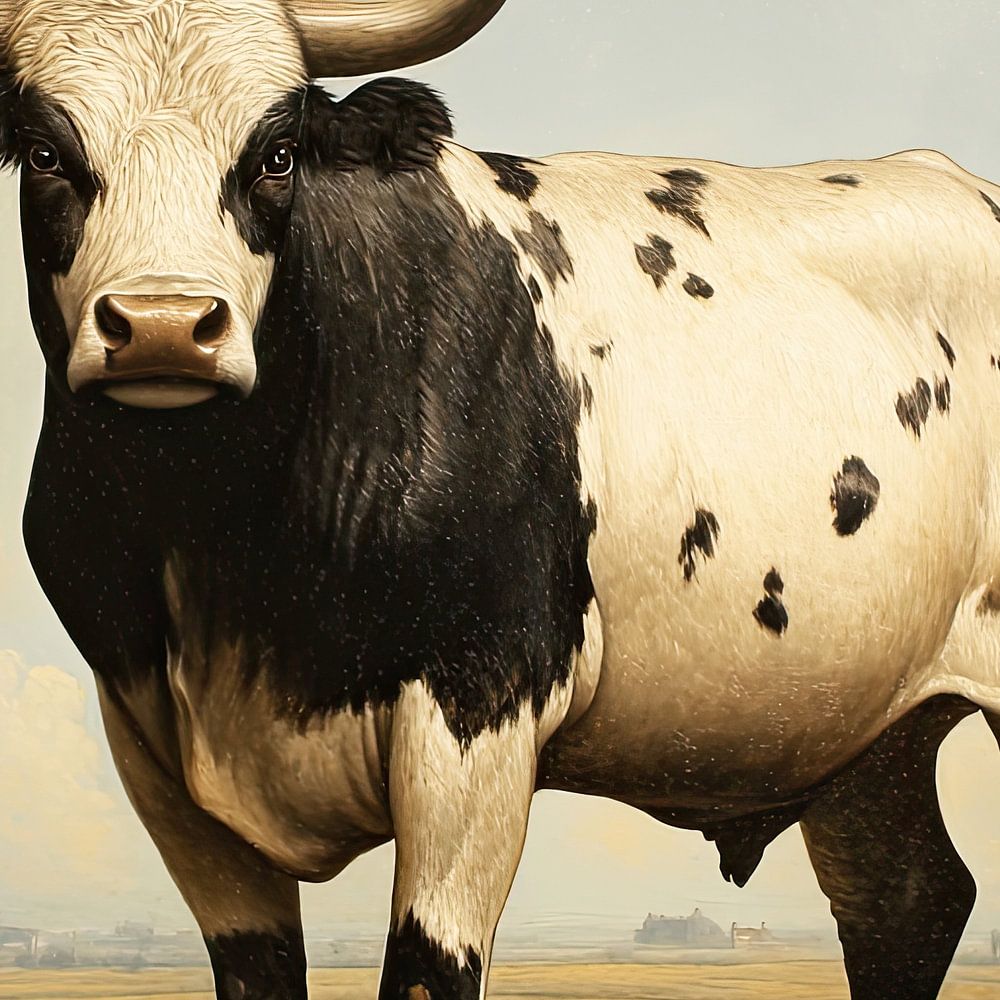 The colour palette consists of earth tones, black and white and soft blues. The bull has a pattern of black and white spots that contrasts sharply with the golden brown background. The sky is light blue with grey and white clouds, creating a calm background.This artwork fits well in a room with a rural or rustic feel. In a living room it brings a nostalgic and timeless element, in a kitchen it reinforces the connection with artisanal and pure food, and in an office or catering establishment with an agricultural or burgundy theme it adds character.