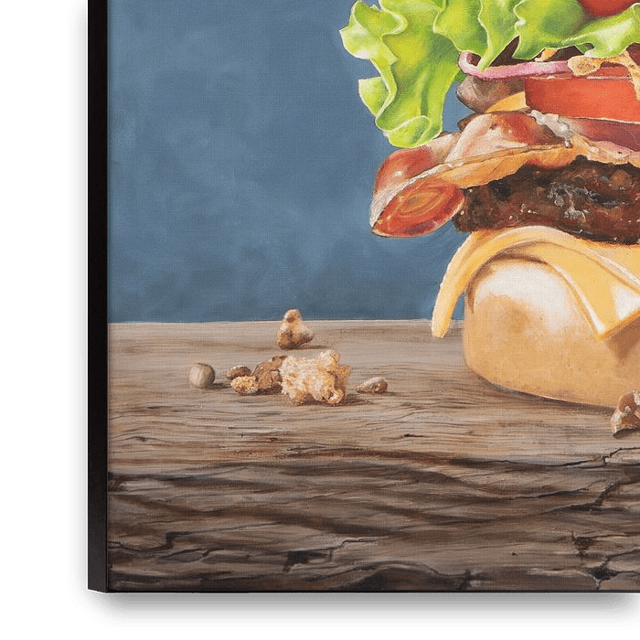 It took me a whole year (!) to paint this; there are so many details in it. It is entirely hand-painted. From the cracks in the wood, the little bits lying next to the burger, the ketchup on the lettuce, right down to the tiny seeds on the bun.