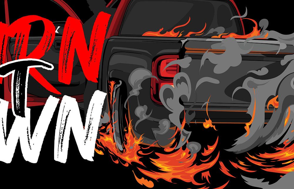 Beside the raging machine, the bold words "Burn It Down" amplify the intensity of the moment, symbolizing unstoppable energy and dominance on the road. This is more than just a display of power