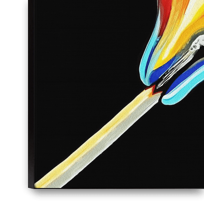 This captivating artwork features a close-up of a burning match, painted in vibrant hues of orange, yellow, and electric blue. The dynamic composition symbolizes passion, creativity, energy, and the spark of new ideas.