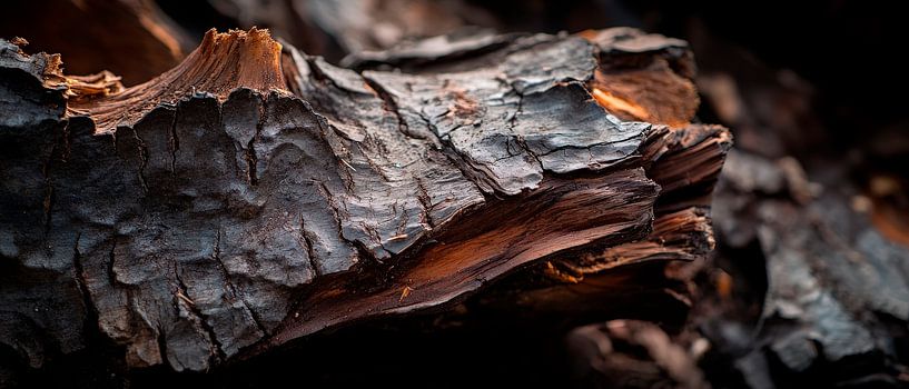 The rough texture of the weathered wood tells stories of nature and time. Dark bark textures and golden accents create a warm, inviting atmosphere. This work of art fits perfectly in a living room, where it brings nature into the home and invites you to linger.