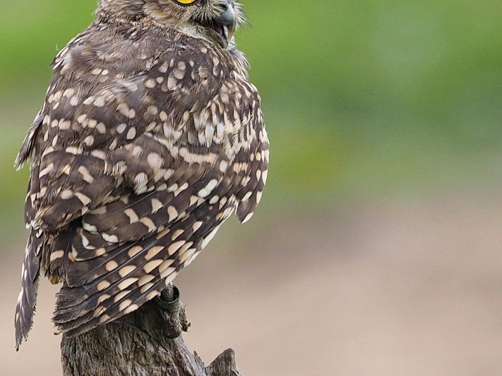 The burrowing owl or rabbit owl (Athens cunicularia, also known as Speotyto cunicularia in the last century) is a member of the owl family. It is a small owl of 18-25 cm long and the burrowing owl stands out further because of its long, scantily feathered legs.