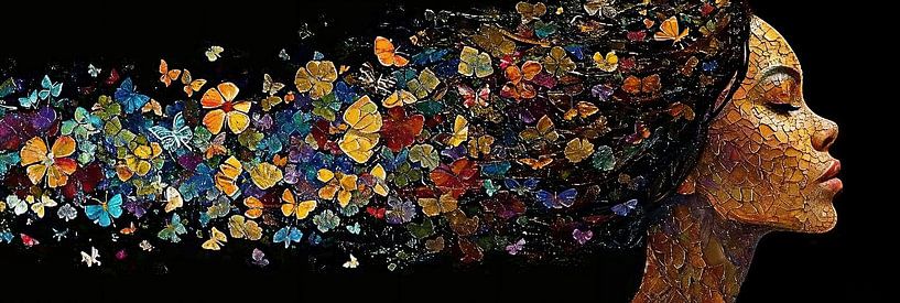 Details: woman, profile, butterflies, colourful, art, modern, creative, painting, portrait, nature