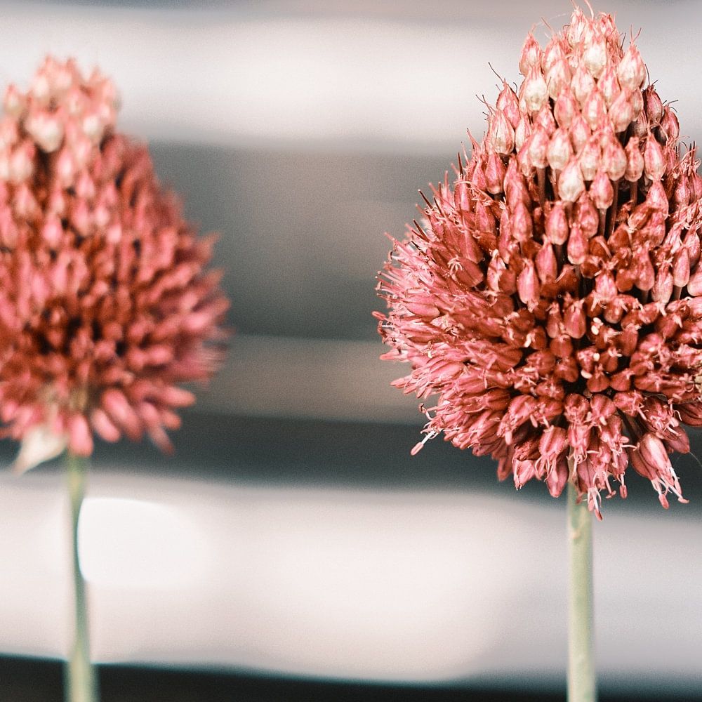 Two pink flower heads stand side by side - round, almost overflowing with life, yet quiet in their dignity. A bee rests on one of the blossoms, a tiny visitor with a great task. It seems like a heartbeat in a still picture, a fleeting movement in a constant cycle.