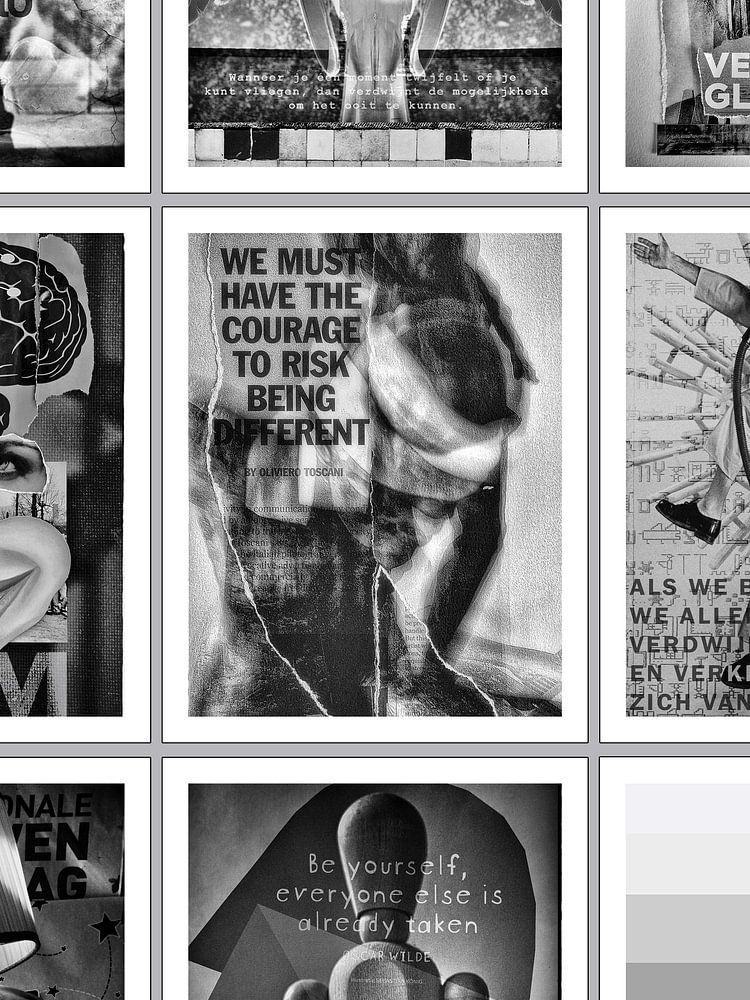 Mixed-Media Collage: Layered textures, surreal contrasts and graphic typography create a dynamic interplay between image and text, inviting deeper reflection.