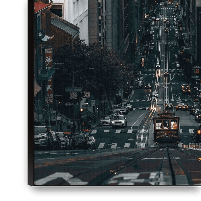 San Francisco cable car on California Street with Bay Bridge in the background. A typical picture how I see the city, with beautiful light.