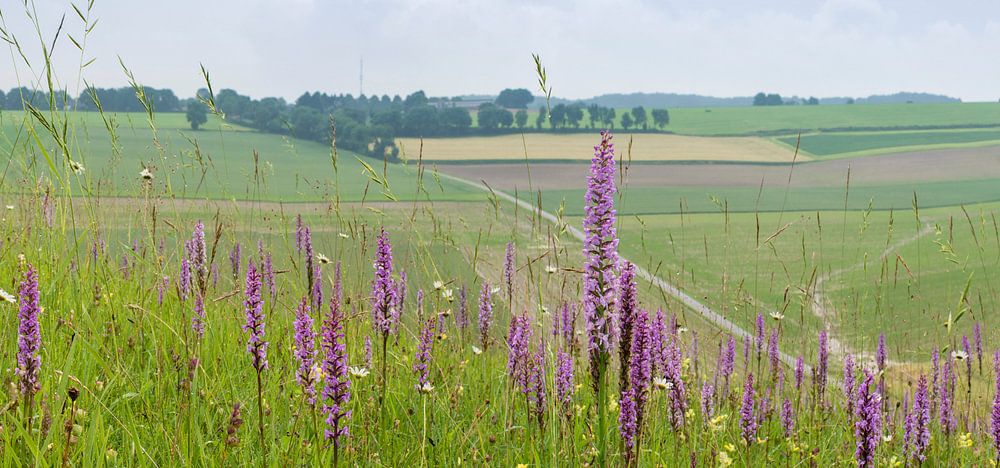 Panoramic view on calcareous grassland with Fragrant orchid (Gymnadenia conopsea) in the Dutch Uplands (Zuid-Limburg).